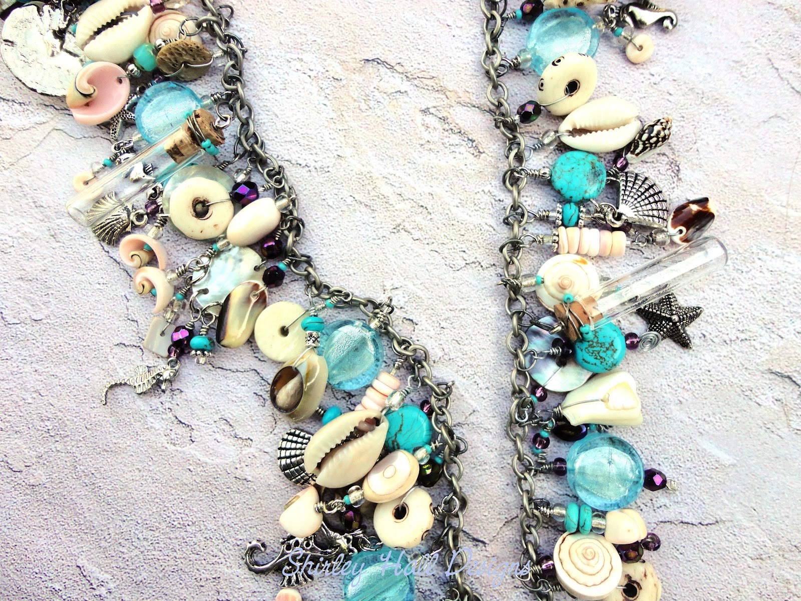 I wanted to make a necklace with some of the "beach-related" components I have been saving for a long time. So this is what I ended up with. I wasn't sure if I liked it when I first got everything hung on the chain because there were more charms I wanted to make. I had originally thought about making things tied directly to the cruise, but loved the shells and the turquoise and purple beads so much, I just kept making them! I might still add some map beads, photos, etc. We'll see how I feel about it later.